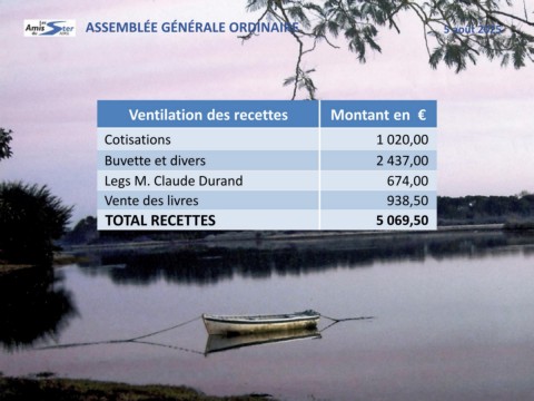 ASSEMBLÉE GÉNÉRALE ORDINAIRE 5 août 2025 Ventilation des recettes Montant en € Cotisations 1 020,00 Buvette et divers 2 437,00 Legs M. Claude Durand 674,00 Vente des livres 938,50 TOTAL RECETTES 5 069,50
